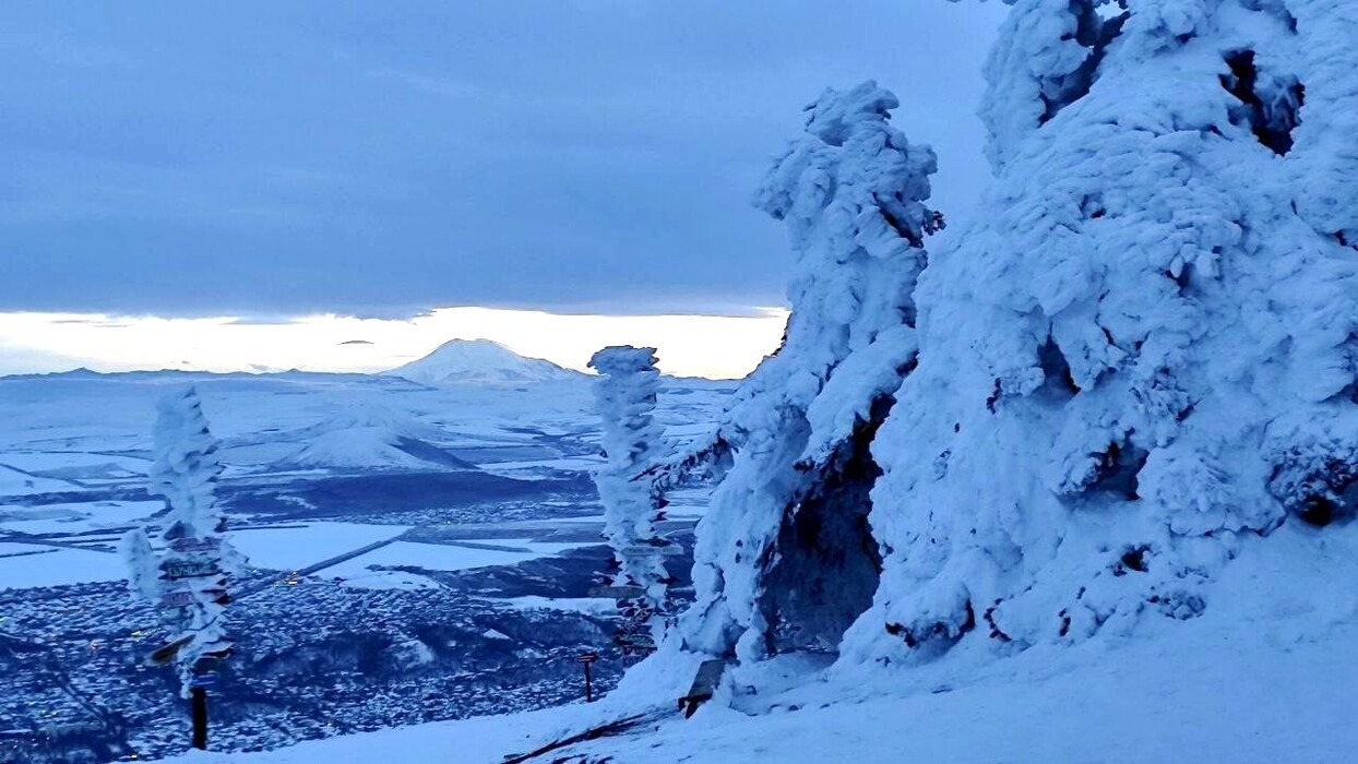 На вершине Машука всё покрыто инеем – деревья, скамейки, артобъекты. Завораживающая атмосфера зимних пейзажей особенно привлекательна на закате или на рассвете, когда хрусталики льда искрятся в солнечных лучах. А если повезёт, можно и Эльбрус увидеть.