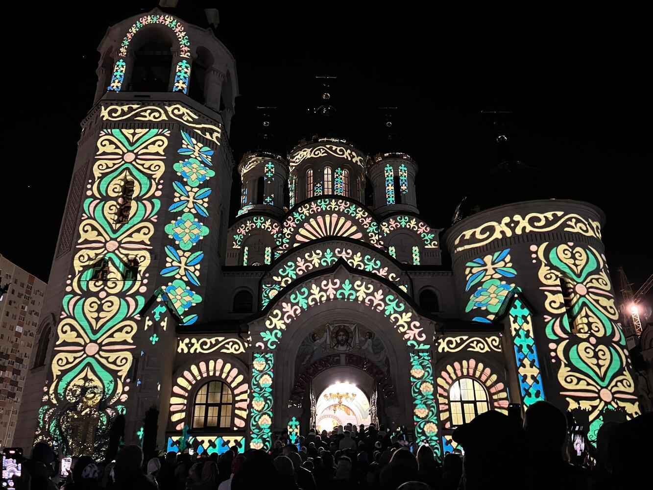 В пасхальную ночь в Ставрополе Владимирский собор преобразился благодаря современной технологии слайд-мэппинг. Это впечатляющее архитектурное освещение позволило на фасадах собора «оживить» православные картины, которые в полной мере передали дух праздника и красоту христианской традиции.