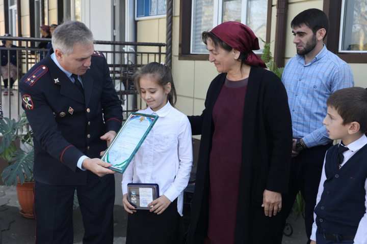 В Ингушетии ученица 4-го класса сельской школы получила нагрудный знак от МВД за содействие, после того, как помогла избитому на ее глазах прохожему, а затем — полиции в раскрытии преступления.