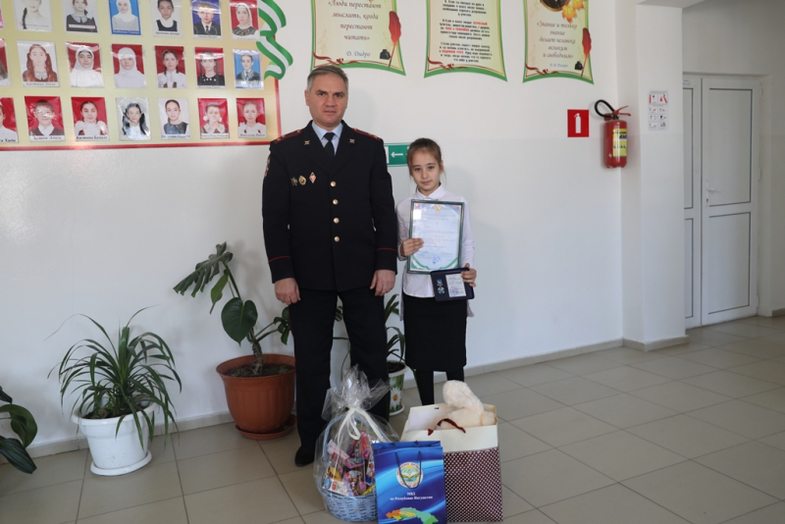 Девочку из села Нижние Ачалуки в Малгобекском районе отметили на школьной линейке, организованной специально в ее честь. В торжественной обстановке полицейские вручили школьнице нагрудный знак и подарки.