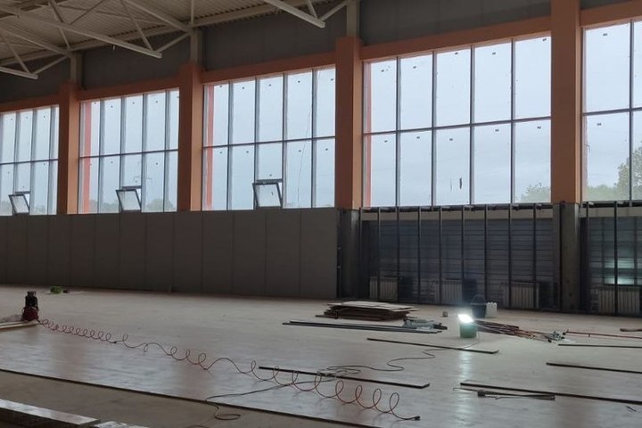 Малый спортивный зал готов к монтажу оборудования, а в большом спортзале и актовом продолжается облицовка панелями и установка потолочной системы.