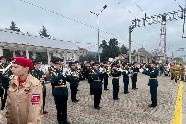 Военный оркестр штаба Северо-Кавказского ордена Жукова округа войск национальной гвардии Российской Федерации встретил ретро-поезд «Победа» в г. Минеральные Воды и принял участие в патриотическом театрализованном мероприятии.