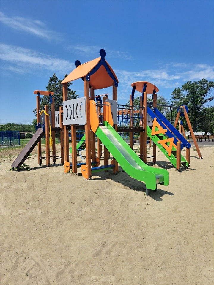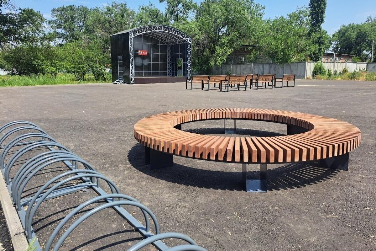 Здесь установили сцену для проведения культурных мероприятий, скамейки и детский игровой комплекс.