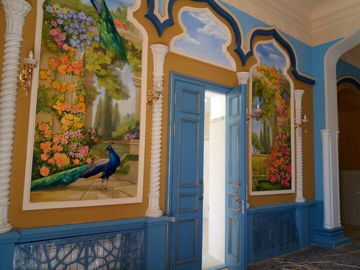 Обильные лепные украшения в индийском стиле – «львиные капители» и керамические панно растительно-животного орнамента (павлины, виноград, цветы) подчёркивали своеобразие лицевых фасадов. Кстати, образ павлина, согласно восточной притче, символизирует возрождение плоти. Керамические панно по эскизам, предположительно, известного художника Михаила Врубеля были изготовлены мастером Петром Кузьмичом Ваулиным в знаменитой московской керамической мастерской «Абрамцево» Саввы Ивановича Мамонтова.