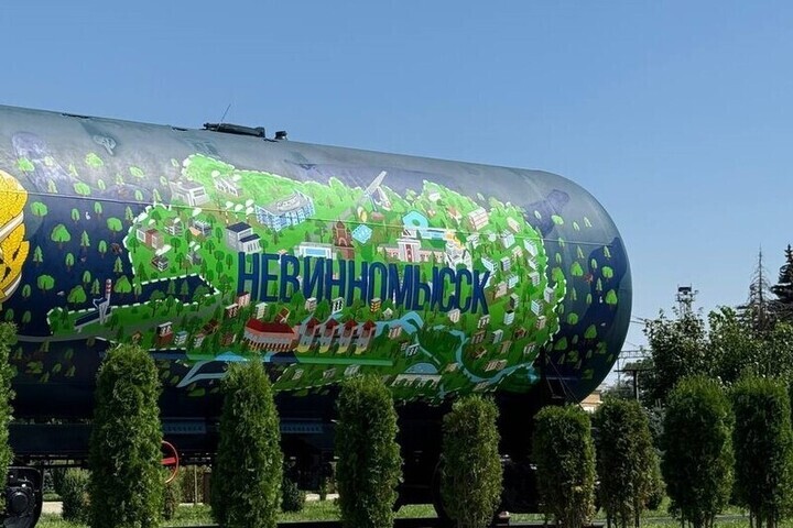 Глава Невинномысска Михаил Миненков опубликовал в своём телеграм-канале фотографии преобразившейся ЖД-площади, на которой установили оригинальный арт-объект – цистерну, украшенную картой города.