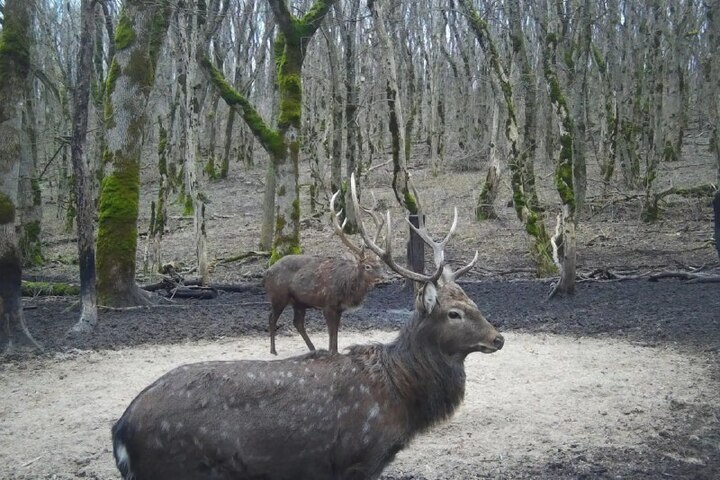 Под прицел фотоловушки попали гордые пятнистые олени. Здесь на этой заповедной территории в дикой природе обитает самая многочисленная популяция пятнистых оленей в крае – свыше 200 голов.